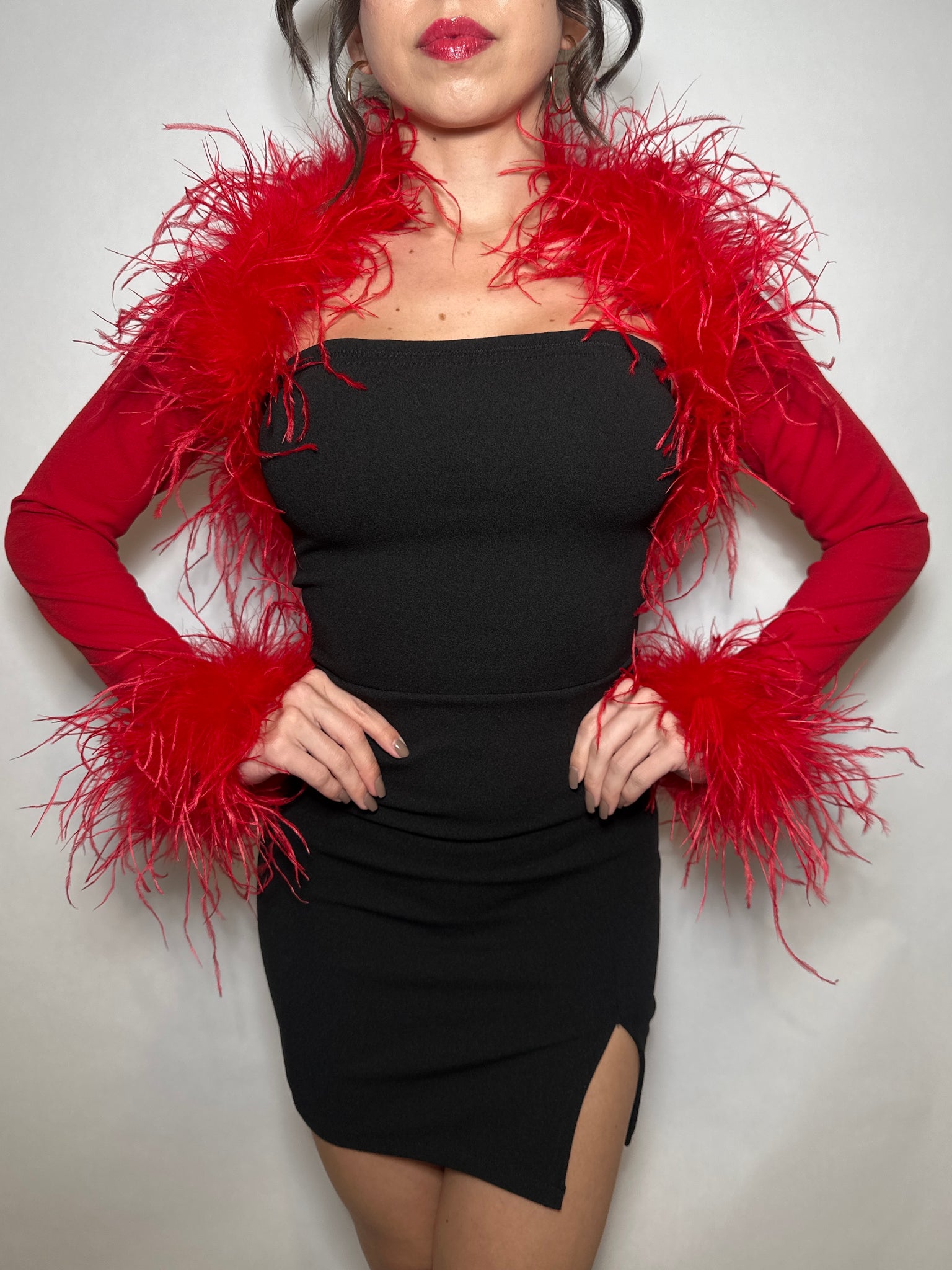 -Luxurious ostrich feather trim on the cuffs and neckline for a bold, high-fashion touch
